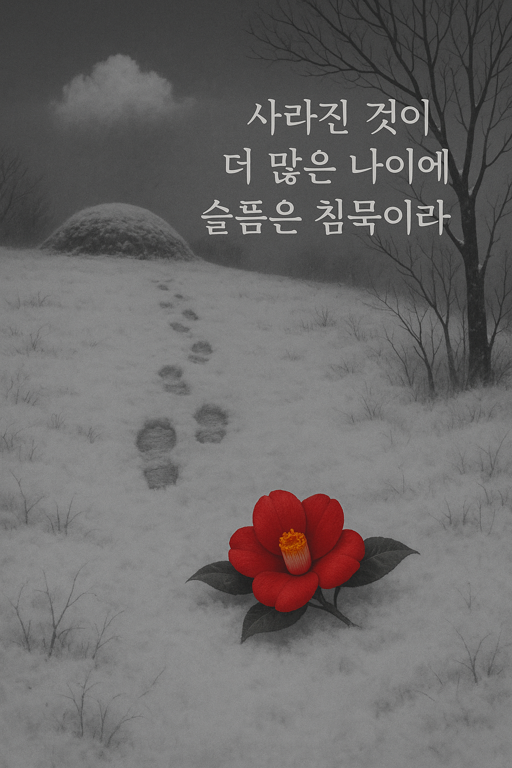 산소 가는 길』은 부모를 잃고, 나이 들어 더 많은 것을 '사라진' 상태로 살아가는 한 사람의 조용한 애도이자 삶의 독백입니다. '산소도 없는'이라는 표현은 단순한 허공의 풍경이 아니라, 삶의 근간을 잃은 허허로운 감정을 응축한 이미지입니다. 붉은 동백꽃처럼 진한 감정을 품었지만, 놓을 곳이 없어 달 속에 떨어지는 그 끝은 곧 인간이 겪는 궁극의 상실, 애도의 불가능성, 남은 이의 숙명을 시적으로 표현한 것입니다.