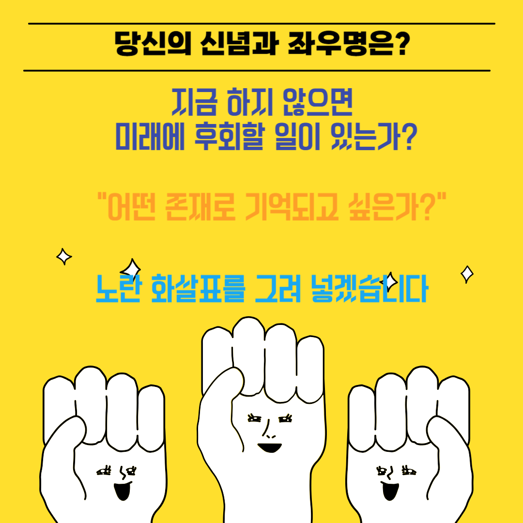 "후배들을 위해 무엇을 남기겠는가? 무엇을 남길 수 있는가?를 생각해야 합니다. 과거나 현재가 아닌 미래를 생각하면서, 미래에 후회하지 않도록 지금을 살아가려고 노력하고 있습니다. 또한 먼저 길을 걸어가는 이들이 해야 할 일은 뒤에 이 길을 걸어올 이들에게 이정표가 되는 것이라고 합니다. “무엇을 자랑스럽게 물려줄 것인가?”를 생각하면서 삶을 살아가려고 노력하고 있습니다. 그것이 제 삶의 의미라고 생각합니다. 그들을 위해 작지만 노란 화살표를 남길 수 있는 삶을 살겠습니다"