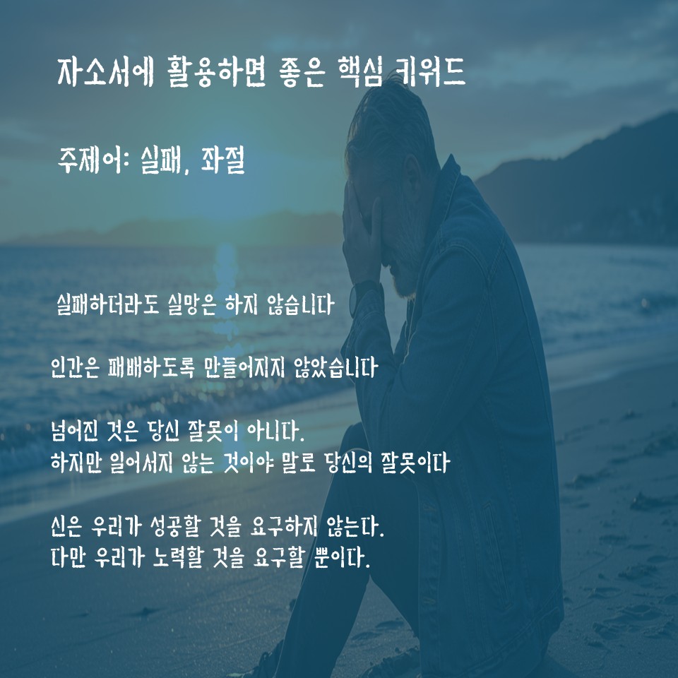 #자소서핵심키워드 #자소서활용주제어 #자소서활용소제목 #실패 #좌절 #자소서신념 #자소서좌우명 #자소서가치관 #의식주 #생각의주인 #노력 #인간은패하도록만들어지지않았다 #실패하더라도실망은하지않습니다